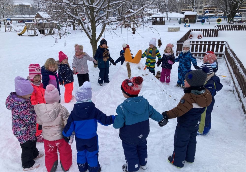 Zasneženi hribček vrtca je postal priljubljeno zbirališče za sankanje in kepanje, kjer so otroci uživali v gibanju na svežem zraku ter krepili svoje gibalne spretnosti. Ob tem so razvijali tudi sodelovanje, veselje do skupne igre in pozitivne socialne odnose.